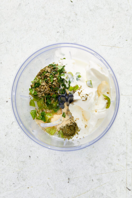 - Place sour cream, chopped cilantro, chopped jalapeño, lime juice, salt, dried dill, dried parsley, onion powder, and garlic powder in a food processor or blender.