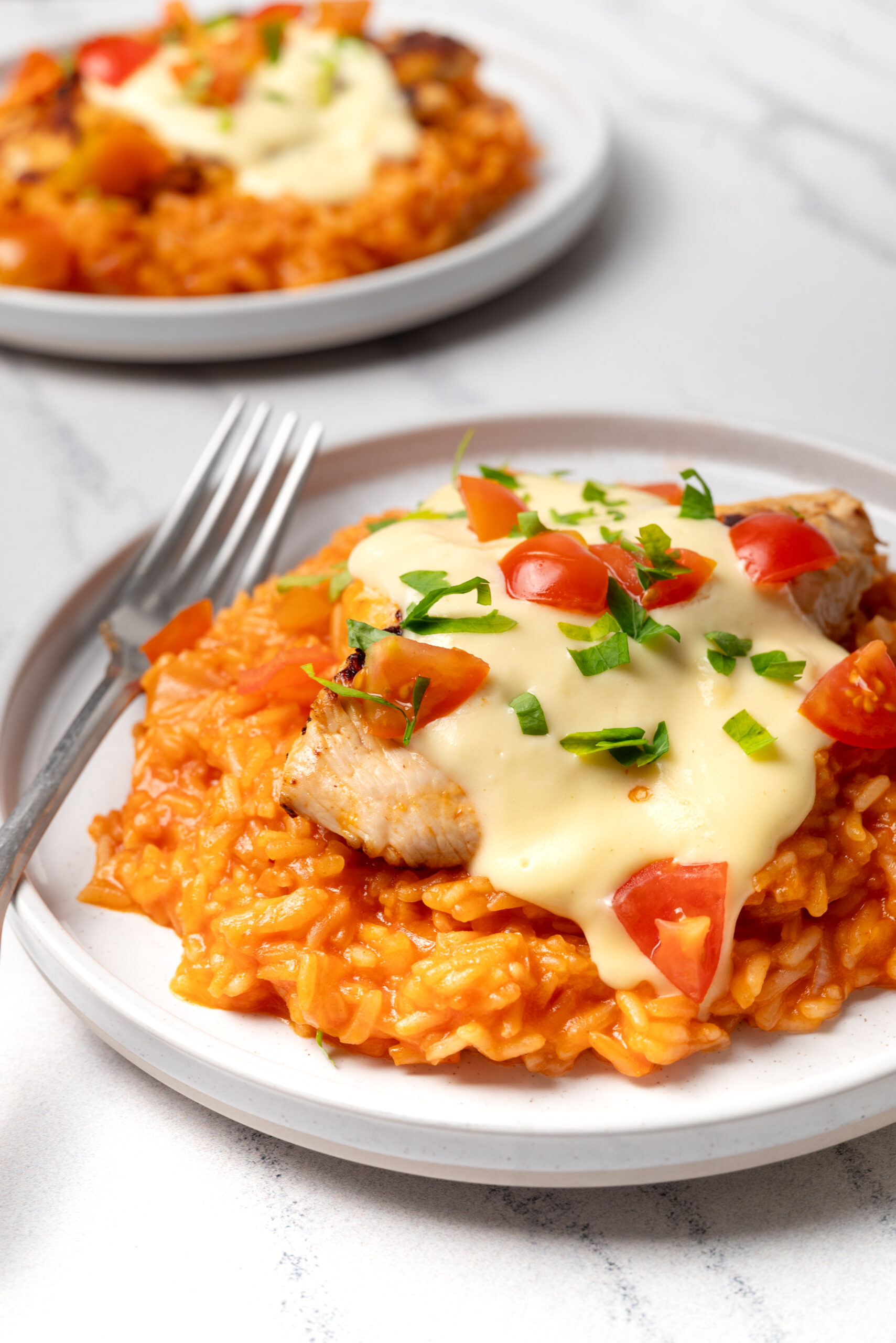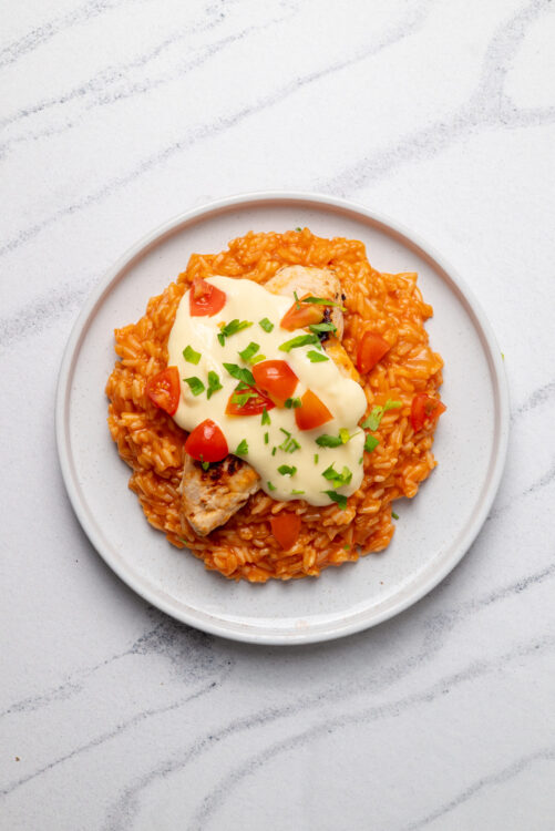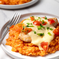 Prepare to discover a new family favorite: this savory chicken and rice dish, covered in melted queso!