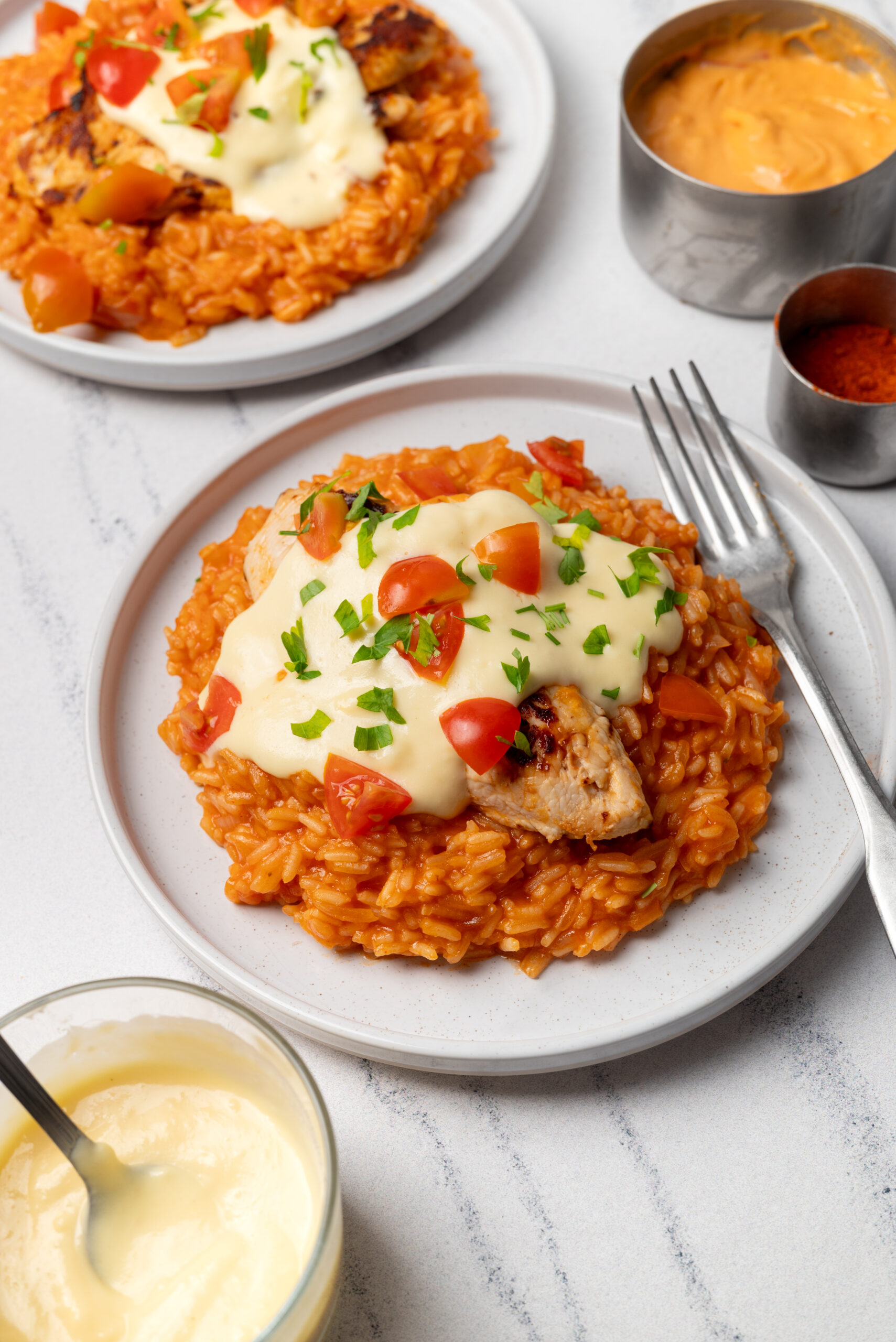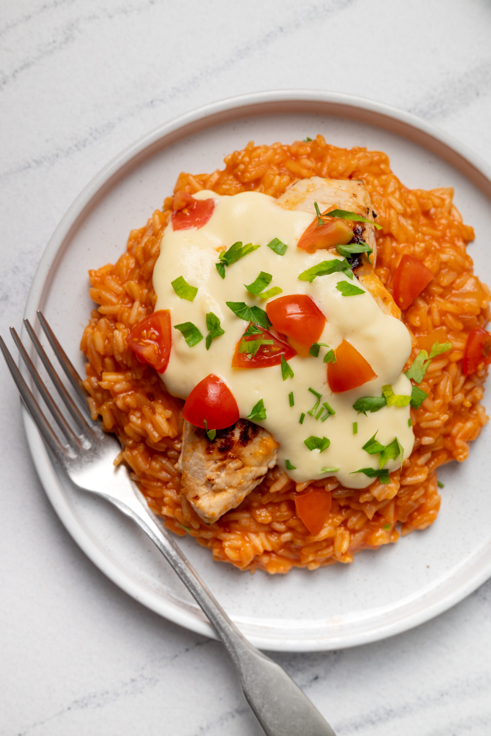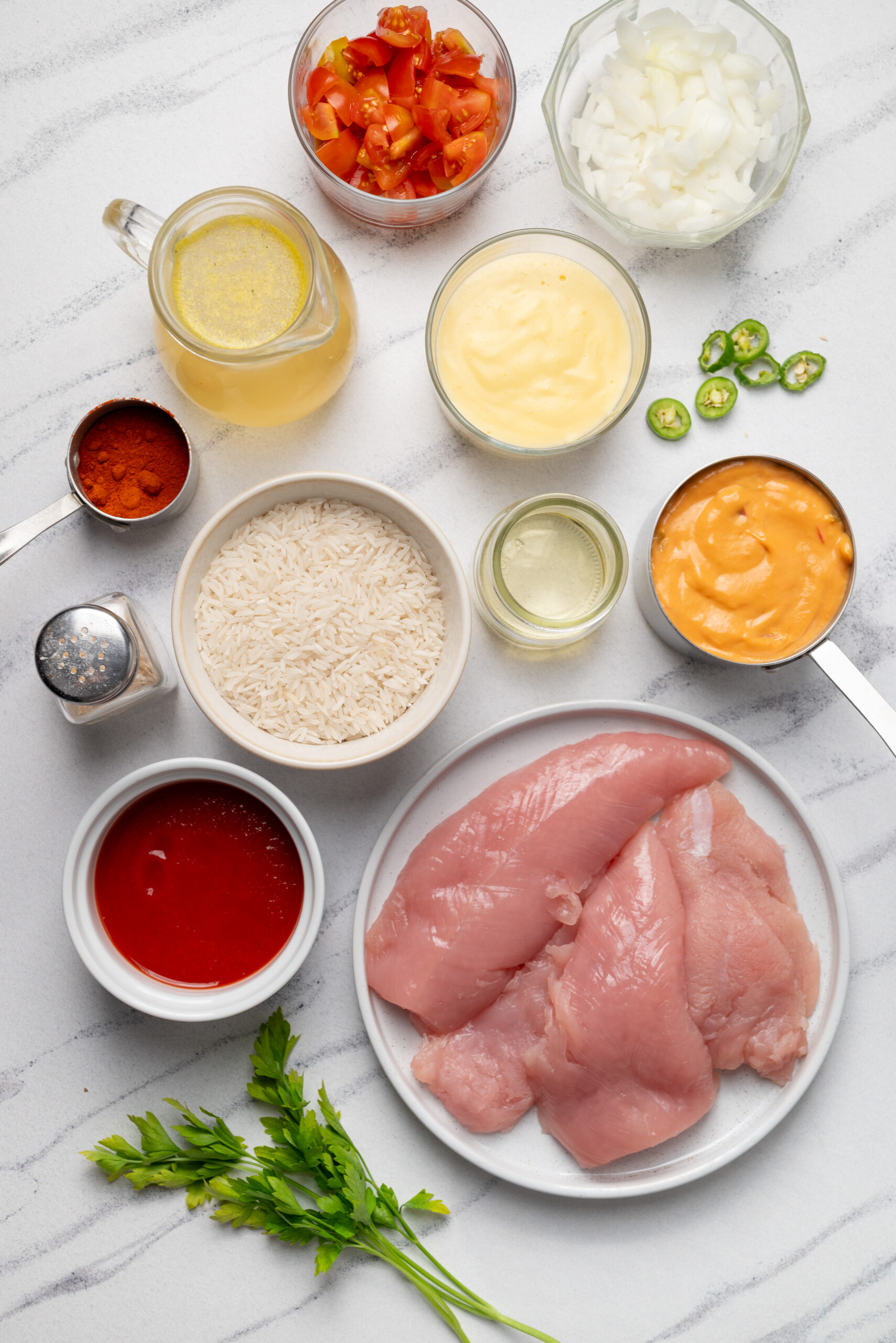 - While the rice cooks, warm the white queso dip as directed on the package. To serve, divide the rice among four plates, top with a grilled chicken breast, drizzle with warm queso dip, and garnish with chopped tomato and cilantro.