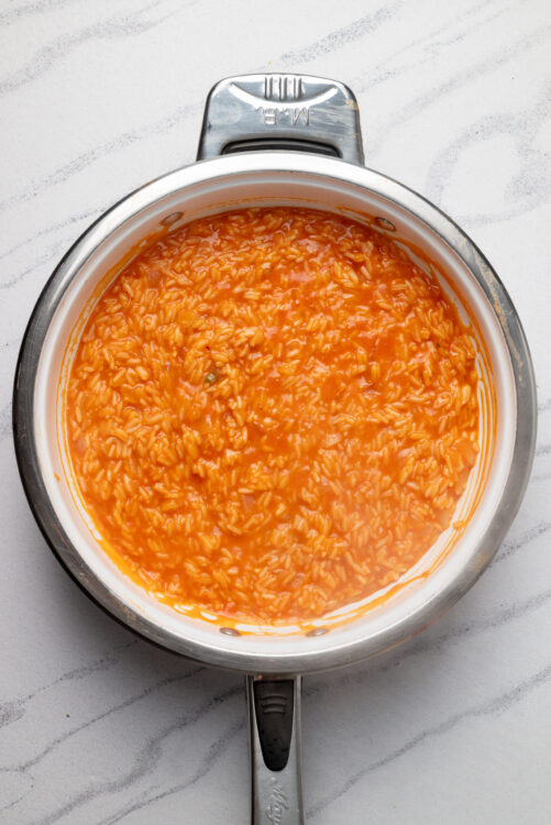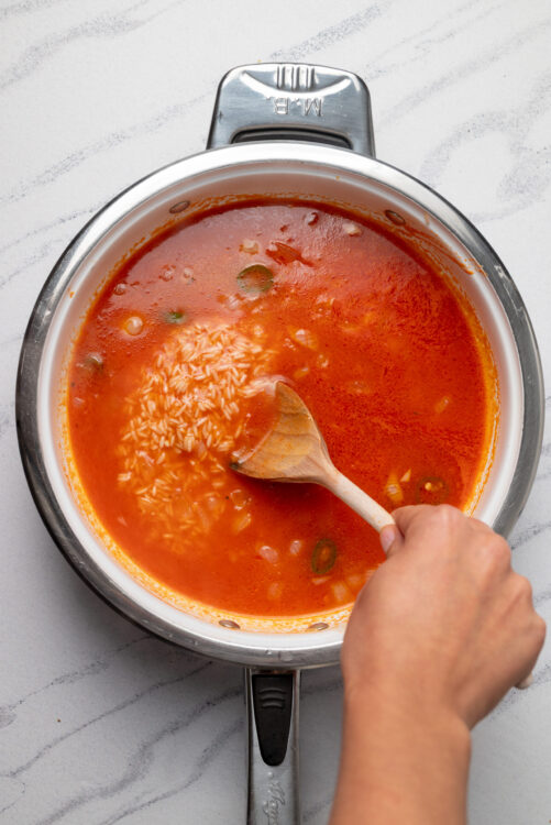 - Bring the mixture to a boil, then cover and simmer on low heat for 20-25 minutes until the rice is tender and the liquid is absorbed.