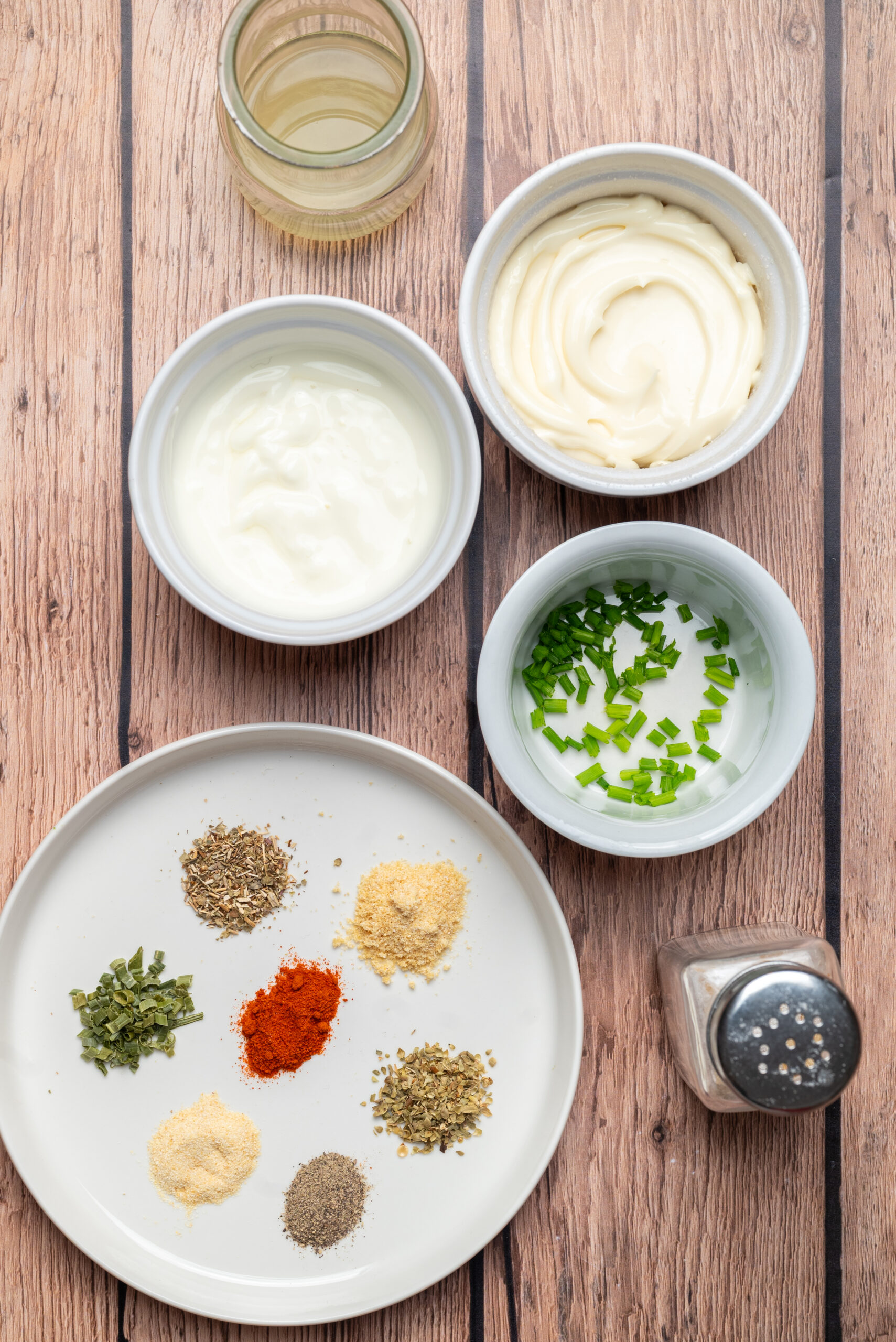 - In a medium bowl, add the mayonnaise, sour cream, garlic powder, dried parsley, dried dill weed, dried chives, onion powder, salt, pepper, paprika, and lemon juice. Whisk until the ingredients are well blended. Add more seasonings or lemon juice as needed.