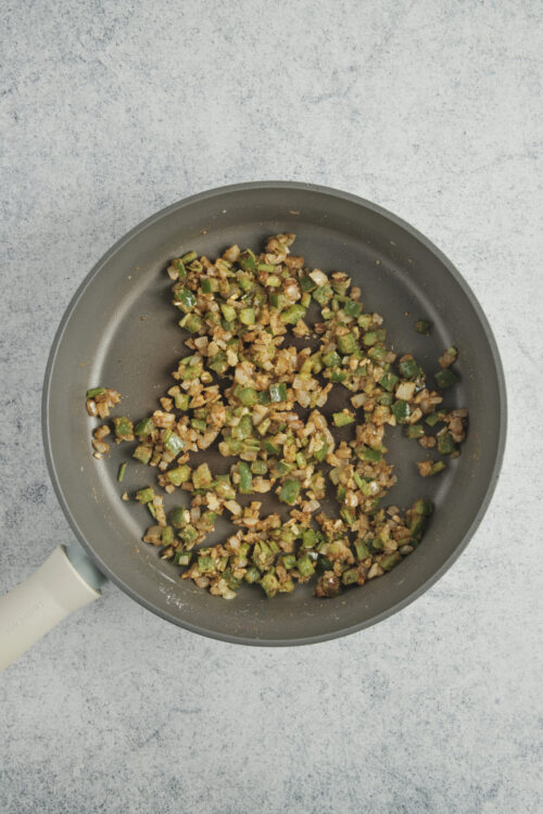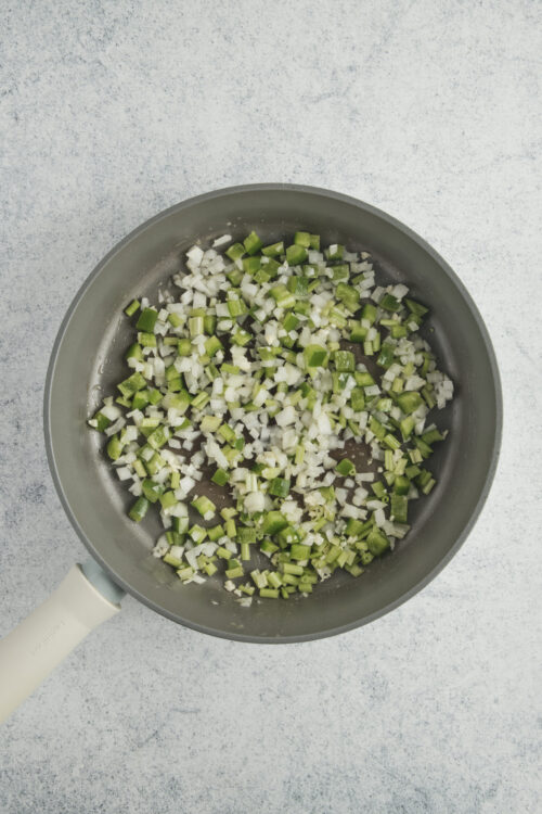 - Melt the butter in a large skillet over medium heat. Add the diced onion, celery, bell pepper, and minced garlic. Sauté until the vegetables are soft, about 5 minutes.