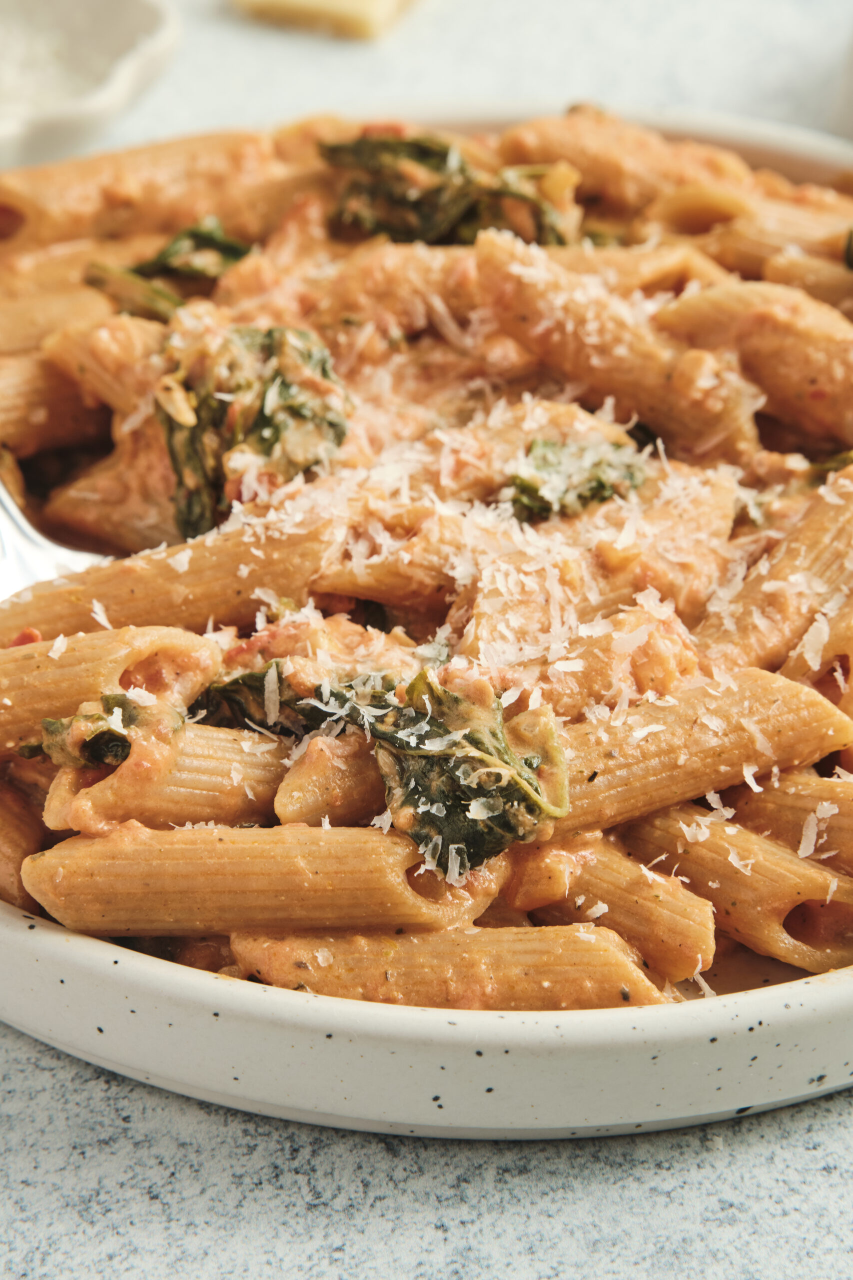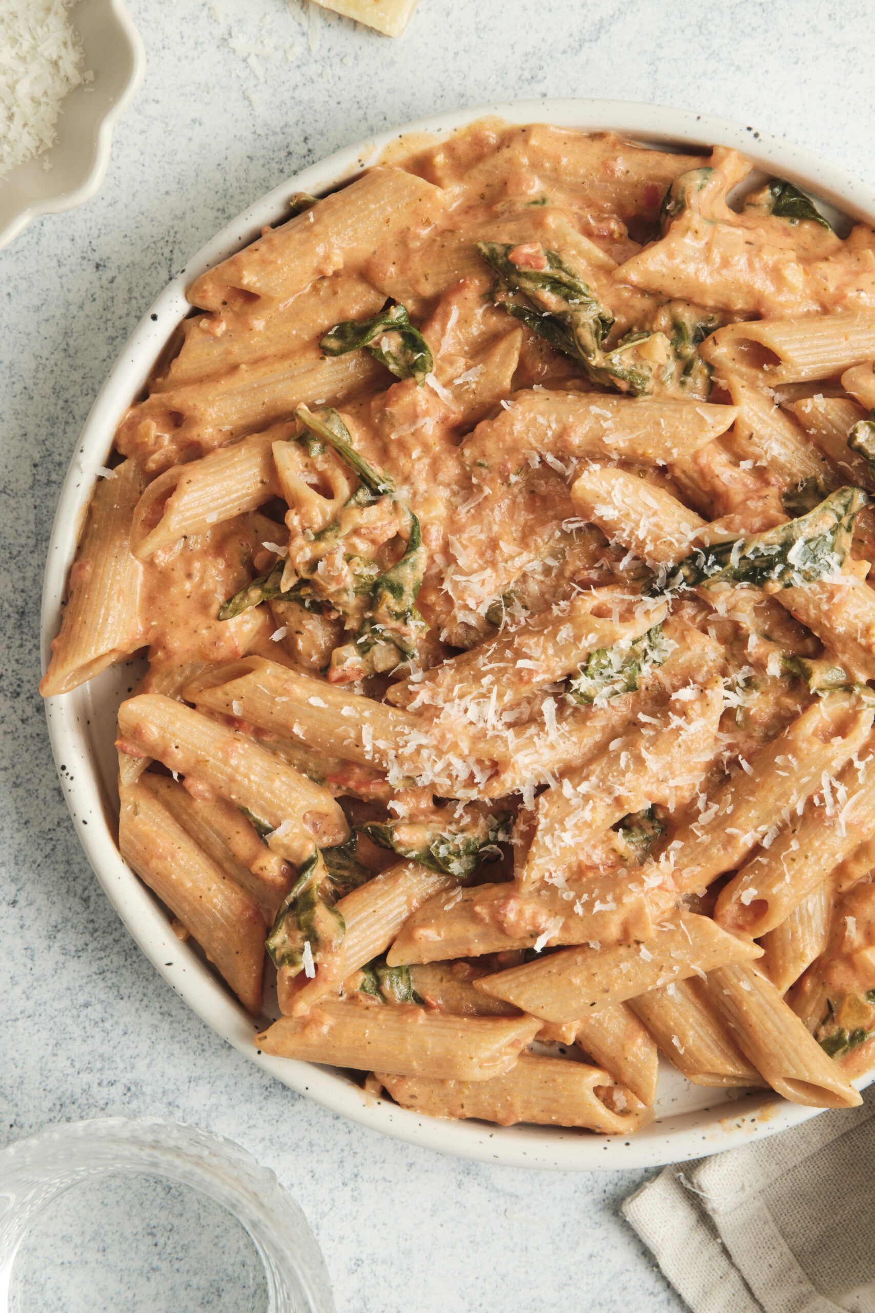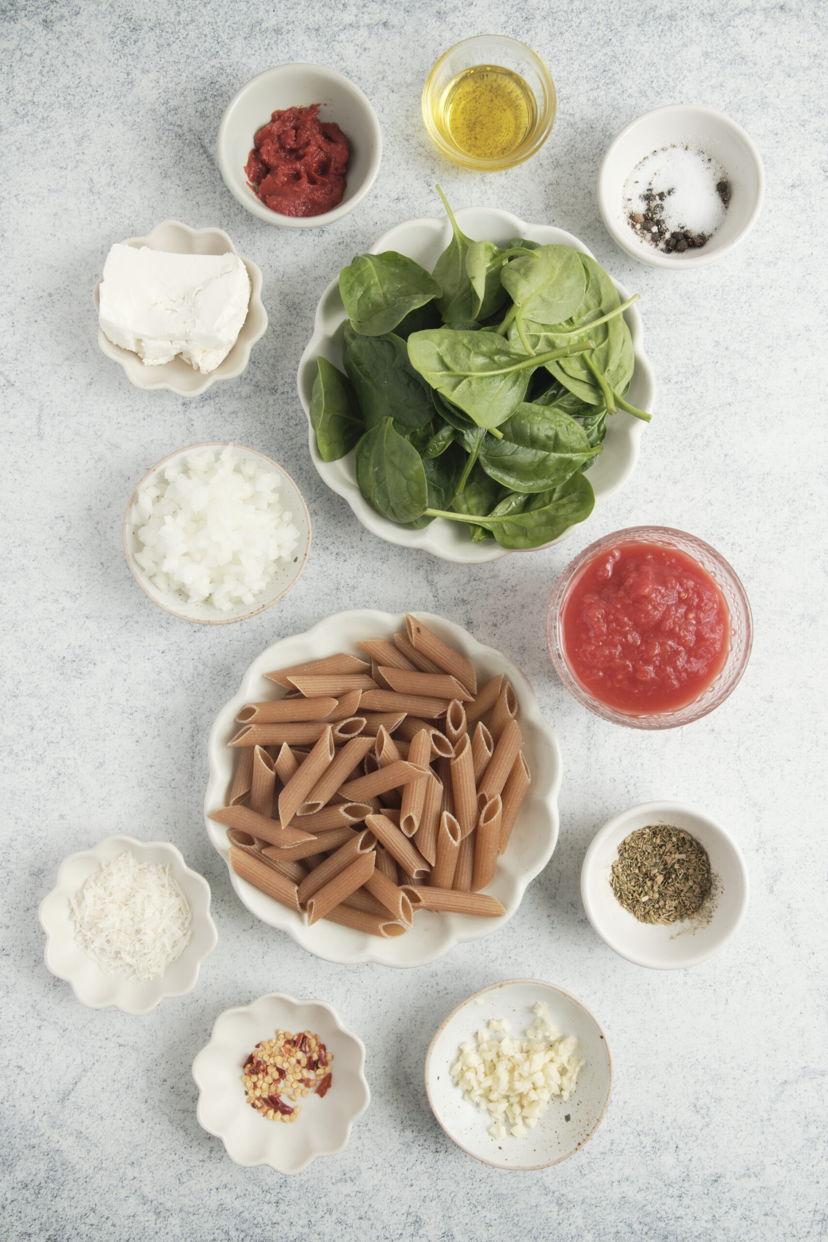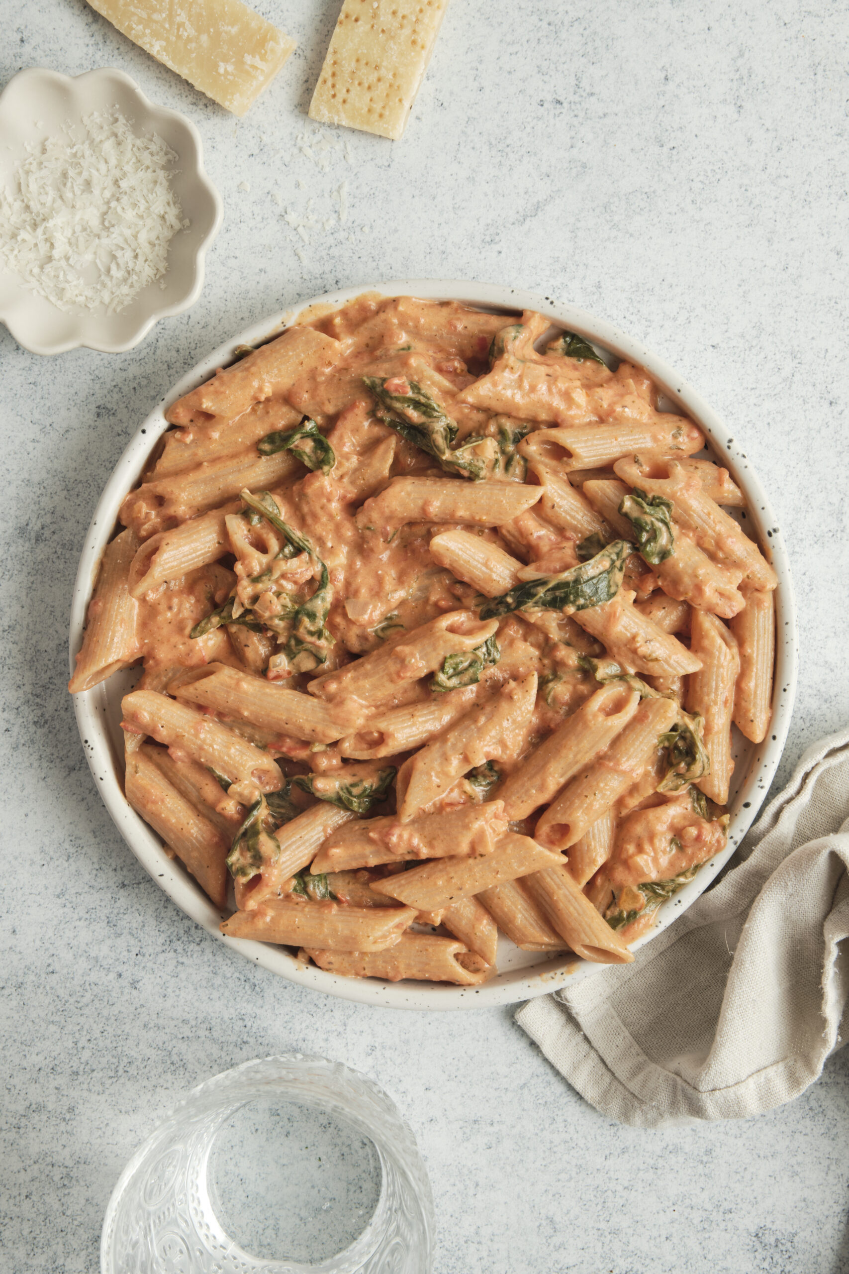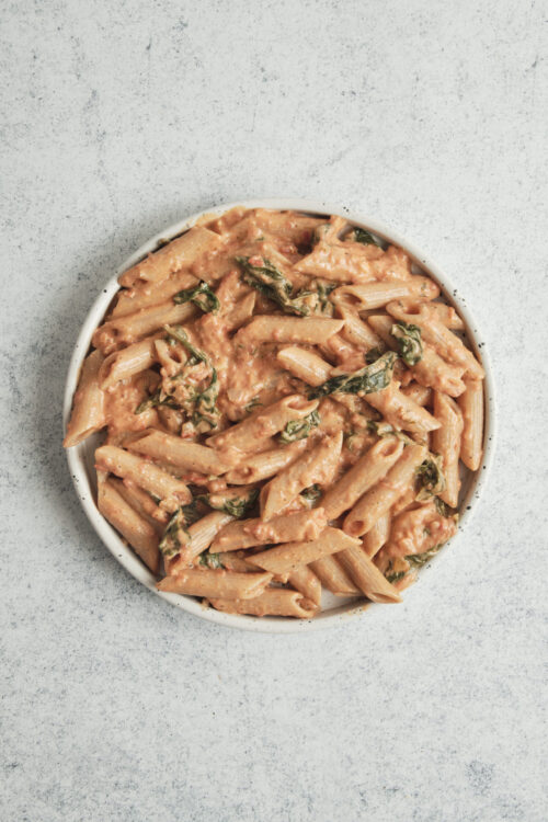 If it were possible to be in love with a recipe, this would be at the top of my list. This recipe for spinach pasta reminds me in many ways of one of my all-time favorite dishes—penne alla vodka—but without the vodka. It has that same type of creamy, garlicky, tomatoey sauce that I love. And, with the added spinach and Italian seasoning, it is bursting with color and flavor. Since I’m gluten-free, I use whatever GF penne pasta or ziti I have on hand. This recipe is equally good with rice, quinoa, chickpea, corn, and lentil pastas. I’ve even used it for shirataki (miracle noodle) ziti for myself. No one else in the family likes shirataki noodles, but I do.