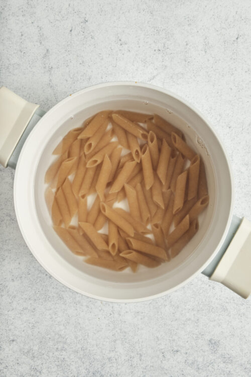 - Bring a large pot of water to a boil and add salt. Add the pasta and cook until al dente (8-10 minutes). Reserve 1 cup of the pasta water and drain the pasta.