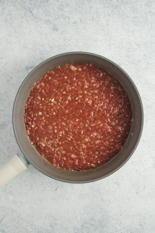 - Heat the olive oil in a large skillet over medium heat. Sauté the diced onion and minced garlic for 3-4 minutes until the onion is soft. Stir in the diced tomatoes, Italian seasoning, red pepper flakes, salt, and black pepper.
