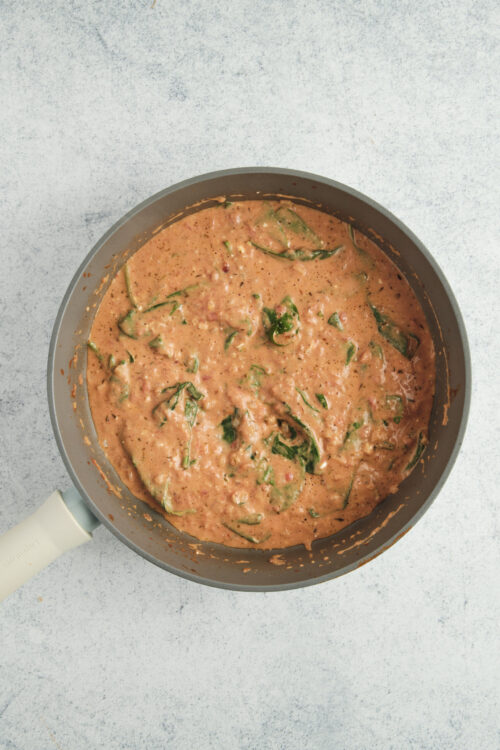 - Let the sauce simmer for about 3 minutes. Lower the heat and add the tomato paste and cream cheese, stirring until it melts into a smooth, creamy sauce. Add the baby spinach and cook until wilted, about 2 minutes.