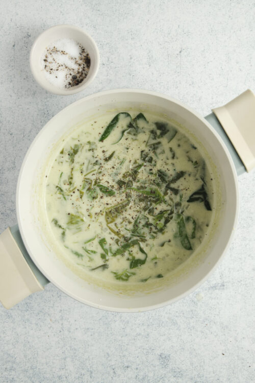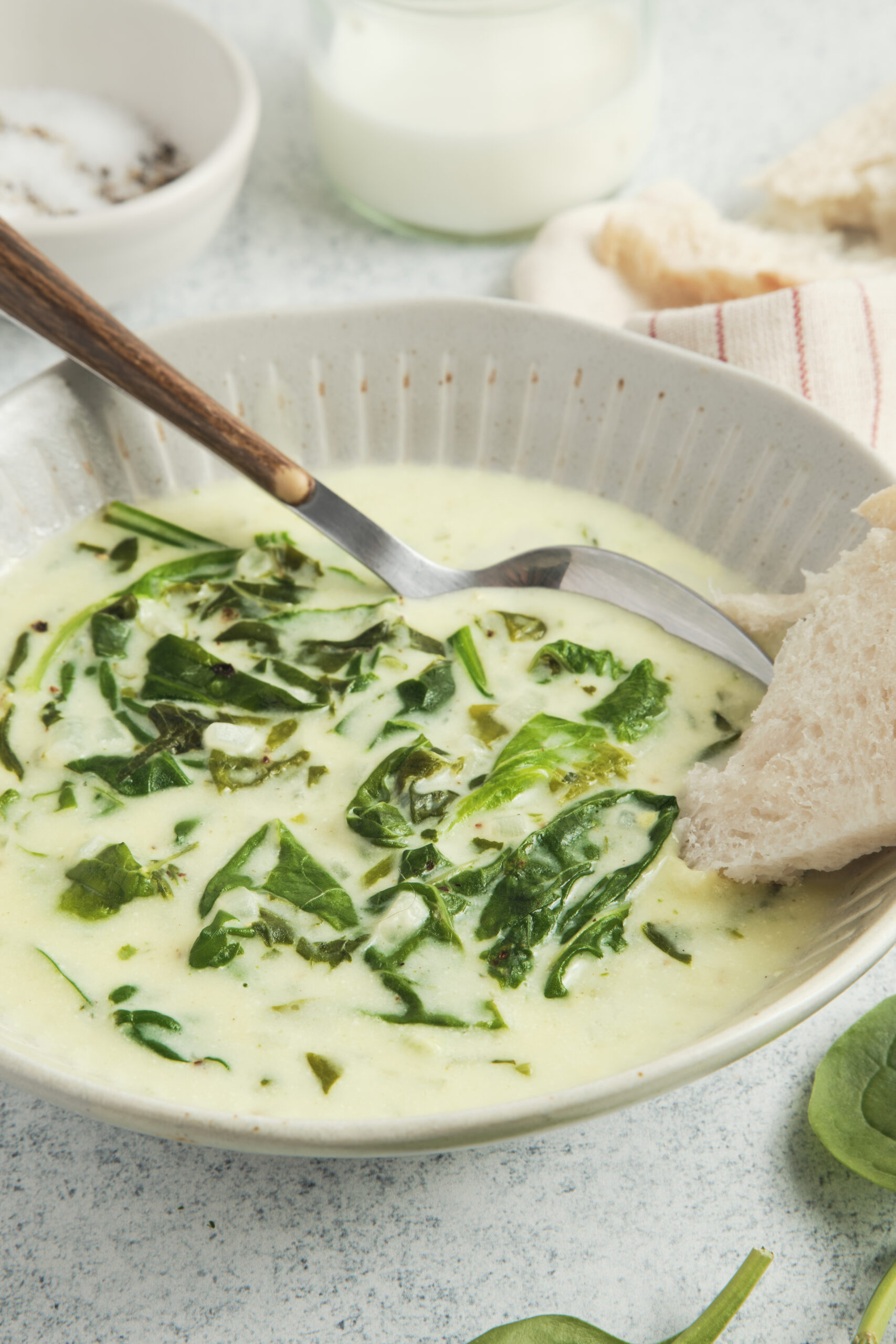 - Pour the creamy sauce into the pot with the spinach base. Stir thoroughly and let the soup simmer for a few more minutes. Add extra broth if it needs thinning. If preferred, blend the soup using an immersion blender. Season with salt and pepper to taste, then serve hot. Enjoy with crusty bread if you like.