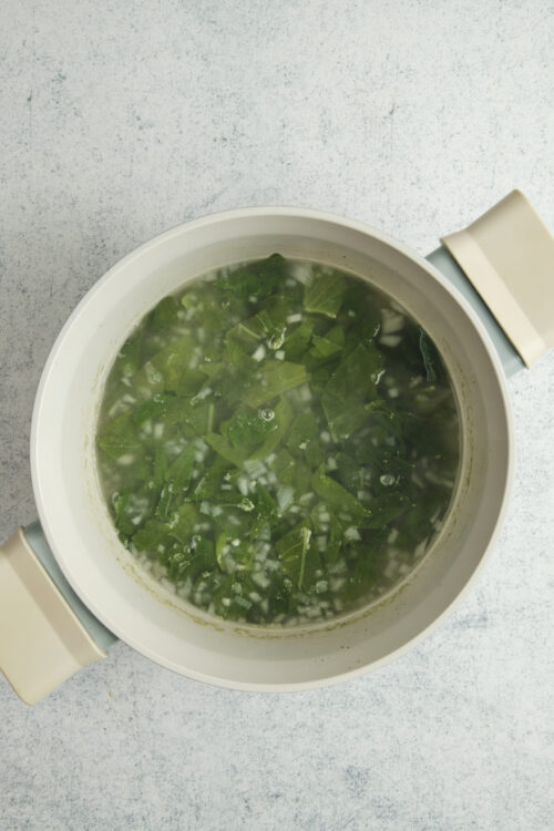 - In a large pot over medium-high heat, combine the chopped spinach, vegetable broth, onion, nutmeg, and garlic. Bring to a boil, then lower the heat and simmer for about 10 minutes until the onion is tender.